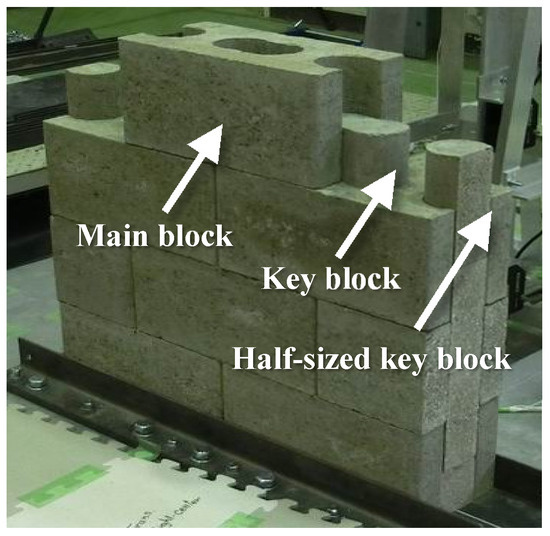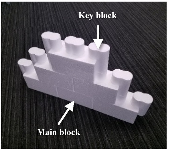 The authors developed two types of concrete blocks to improve the seismic performance, in both the in- and out-of-plane directions, and enhance the workability, without the joint mortar [35]. The two types of concrete blocks only consist of main and key blocks, and they have different key block shapes. One is the peanuts shape and the other is the H shape, as shown in Figure 3.