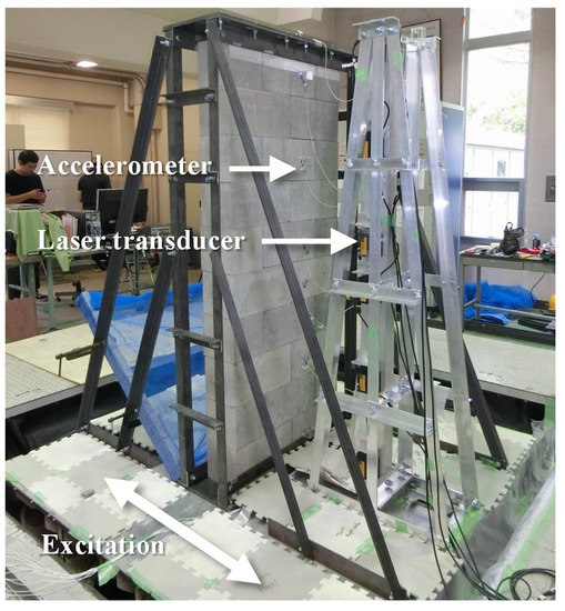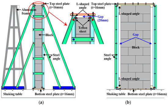 The test setup of the shaking table test is shown in Figure 7. Masonry walls are generally fixed to the slab and beam with mortar at the top and bottom, and the out-of-plane behavior of the wall is formed by the behaviors of the building and the wall itself. In this test, due to the restrictions of the experiment equipment, the behavior of the building was not reproduced, and only the out-of-plane behavior of the wall itself was considered. In order to reproduce this constraint, the specimen was built within the steel frames, as shown in Figure 7. To avoid the development of vertical force on the specimen, due to vertical confinement by the steel frame, a vertical gap of approximately 20 mm was left between the specimen and the top steel plate, whereas the specimen was tightly sandwiched by the rigid L-shaped angles to prevent horizontal slip of the specimen on/at the bottom/top steel plates during excitation. Thus, a roller condition with a freedom in the vertical direction was created at the top by inserting Teflon sheet between the L-shaped angle and the block wall, preventing vertical friction.