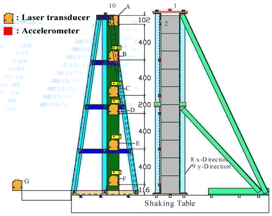 A shaking table of 2 × 2 m was used for the test. It had a maximum earthquake acceleration of 8.9 m/s2, with a restricting weight of 1000 kg. To measure displacement and acceleration over the specimen’s height during the test, six laser transducers and ten accelerometers were installed at different locations, as shown in Figure 8 and Figure 9.