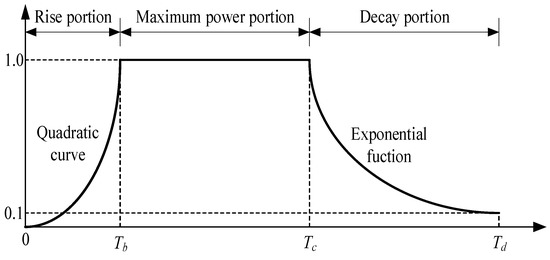 In this study, since the earthquakes of maximum acceleration level, specified in the current seismic design provisions of Korea, have not occurred, a random Fourier phase spectrum and deterministic time-envelope function were used to create an artificial seismic wave. The duration envelope function of an artificial seismic wave used the method suggested by a previous study, as shown in Figure 11 and Equations (6)–(12) [37]. The magnitude of an earthquake, to determine the duration envelope function, was set to M = 8.0, considering the maximum seismic intensity that can occur in Korea in the future.