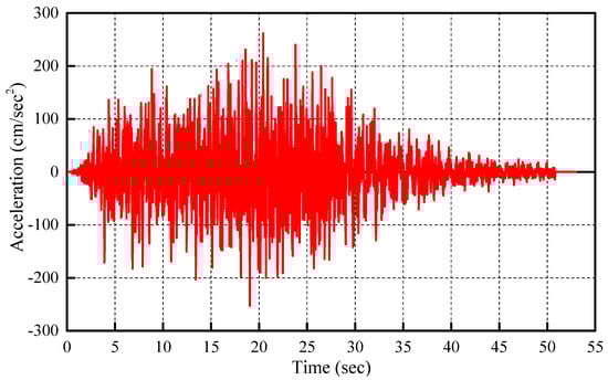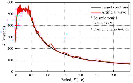 Figure 12 shows the artificial seismic wave, obtained based on the above process, and the maximum acceleration is approximately 2.5 m/s2. Figure 13 shows the elastic acceleration response spectra of artificial ground motions, with 5% of critical damping, corresponding to the design response spectrum at seismic zone 1 and site class SD. In addition, the test was performed under 12 input stages, i.e., 10% (0.25 m/s2), 30% (0.75 m/s2), 50% (1.25 m/s2), 75% (1.88 m/s2), 100% (2.5 m/s2), 120% (3.0 m/s2), 150% (3.75 m/s2), and 160% (4.0 m/s2), of 5 times of the artificial seismic wave.