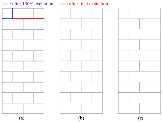 Figure 14 shows the failure patterns of each specimen after final excitation. As shown in the figure, in Specimen CB, the cracks occurred at the top bed joint mortar and head joint mortar during 150% (3.75 m/s2) and 160% (4.0 m/s2) stages, respectively. Whereas in Specimens HB and PB without joint mortar, no damage occurred, including the block unit, until the final excitation.