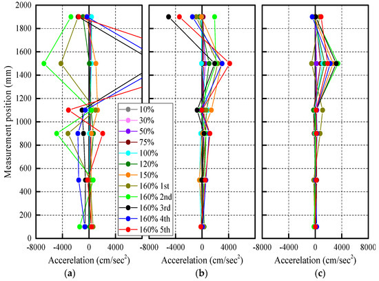 Acceleration profiles: (a) Specimen CB; (b) Specimen HS; (c) Specimen PS.