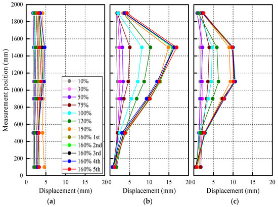 Displacement profiles: (a) Specimen CB; (b) Specimen HS; (c) Specimen PS.