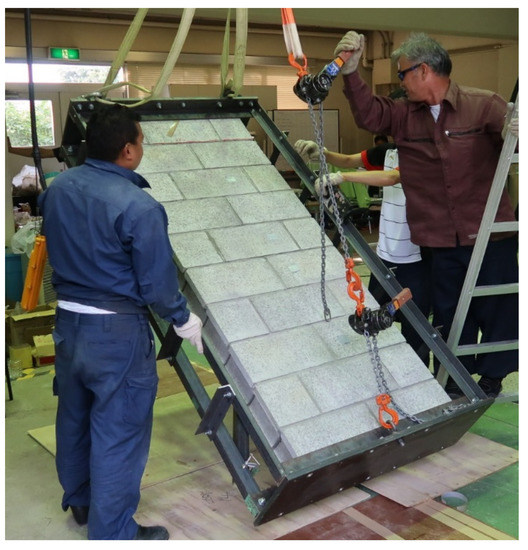 Since all specimens did not occur, the out-of-plane failure in the shaking table tests was calculated in advance; the specimens used in the shaking table tests were used in the four-point bending tests. Therefore, it is necessary to lay down each specimen to perform the four-point bending tests. Figure 18 shows the overview of laying down work. The specimen was carefully laid down, so that no force, other than self-weight of the specimen, was applied. However, Specimen CB collapsed when the inclination angle α was 21°. The force that caused the out-of-plane failure was 3.4 kN, using Equation (13).