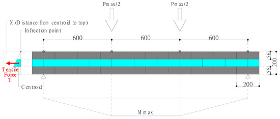 In this study, the maximum tensile strength by the four-point bending tests was calculated to evaluate the out-of-plane seismic capacity of the proposed block system. In calculating the maximum tensile strength, it was assumed that the center of inflection point of stress was on the upper surface of the wall and only the key block resisted, as shown in Figure 19.