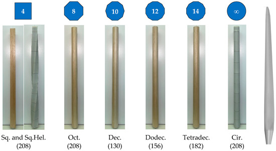 Figure 1 shows the shapes of polygonal towers and blade used in the wind tunnel tests. In this study, the seven polygonal towers were considered. A circular tower size, as a prototype, was determined, considering existing wind turbines with a bottom diameter of 6 m and a top diameter of 4 m. The heights and cross-sectional areas of the polygonal towers were designed to be the same as that of the circular tower. The numbers in parenthesis are the number of pressure taps on the towers. Blades were made on the basis of the LM-Glasfiber blade [13], and a box-shaped nacelle and a half prolate spheroid hub were used. For direction comparison, the same hub, blade, and nacelle (topside structure) were used for all polygonal-cross-section towers.