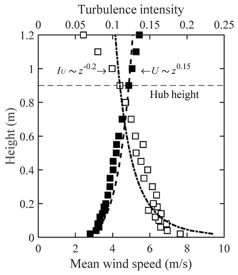 Reynolds number was defined by using reference length and reference wind speed at hub height, and Reynolds number was about Re = 1.8 × 104 for the smooth-surfaced circular tower. The maximum blockage ratio by wind turbine model was less than 2%; thus, corrections were not applied to the experimental data.