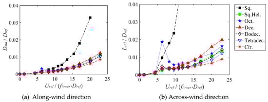 Figure 7 shows the maximum fluctuating displacements for wind turbines installed on seven polygonal towers. Here, maximum fluctuating displacements were defined as the largest fluctuating displacement for all wind directions and all azimuth angles at a specific wind speed. Surprisingly, small differences in maximum fluctuating displacements were found among polygonal towers, except for those in the across-wind direction. For those displacements, although the square wind turbine showed greater values than the others, no instability or limited vibrations, which were observed for the tower-only cases as shown in Figure 5, were observed. This was assumed to result from the existence of the blades.