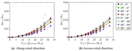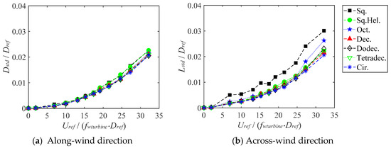 Figure 6 shows the fluctuating displacements in the along- and across-wind directions for a square wind turbine. In the present study, a wind turbine with a square-cross-section tower was simply referred to as a square wind turbine, which is true for all other polygonal cross-section towers. Like the tower-only case in the along-wind direction, the fluctuating displacements increased proportionally to the square of mean wind speed, but unlike the tower-only case, very small differences were found between the along- and across-wind directions. This trend was true for the wind turbines with other polygonal towers.