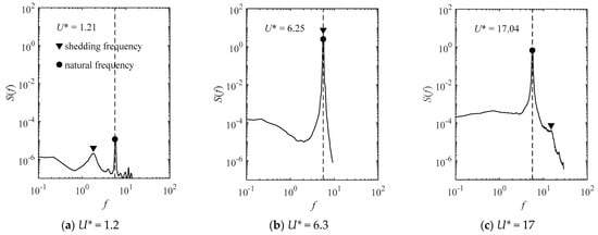 Power spectral densities of displacements at hub height were obtained to investigate the characteristics of vortex shedding condition of tower-only and wind turbine cases. One example of the power spectral densities of the octagonal tower-only case is shown in Figure 8 for some reduced velocities. The dotted vertical line indicates the system’s natural frequency. For reduced velocity U* = 1.21 (Figure 8a), two clear peaks were found. The left peak corresponded to the vortex shedding frequency fs (▼ in the figure) and the right peak to the system’s natural frequency f0 (● in the figure), showing a slightly greater power for the system’s natural frequency. When the reduced velocity increased near U* = 6.25 (Figure 8b), only one peak was found, indicating that a lock-in mechanism occurred. As the reduced velocity further increased, a peak corresponding to the vortex shedding frequency was again able to be found in the high-frequency range (Figure 8c). The peak in the high-frequency range was quite small, and the reason for this can be understandable when the power spectral density of the displacement is calculated from the displacement mechanical admittance and the power spectral density of the generalized force [16]. The small peak in the high-frequency range after the lock-in range resulted from the characteristics of the displacement admittance function, i.e., it gave an almost constant value when the frequency was lower than the system’s natural frequency, but it dropped quickly right after the system’s natural frequency and approached zero. This quick drop was attributed to the small peak in the high-frequency range. Similar discussions can be made for other polygonal towers, but it was found that the peaks in vortex shedding frequency were largely suppressed for polygonal cross-sectional towers. For the reduced velocity where instability vibrations were observed, the peak powers corresponding to the system’s natural frequencies greatly increased, as also explained by Kawai [17].