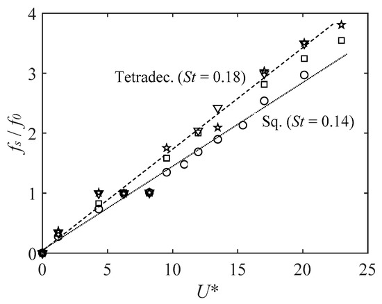 The reduced shedding frequencies fs/f0, which were identified from the peaks in power spectral densities, are plotted in Figure 9 with reduced velocities U* for several polygonal towers. The obvious lock-in range where the vortex shedding frequency was close to the system’s natural frequency deviating from the linear trend was clearly found. The lock-in range for the square and octagonal towers began near reduced velocity U* = 6.25, and for the dodecagonal and tetradecagonal towers started near reduced velocity U* = 4.32, showing a larger lock-in range. For the dodecagonal and tetradecagonal towers, even though lock-in began at a smaller reduced velocity, peak powers in power spectral densities were smaller than those for the square and octagonal towers. When the reduced shedding frequencies fs/f0 were plotted with reduced velocities U*, the slopes shown in Figure 9 can be interpreted as Strouhal number St, which is a dimensionless parameter commonly used to examine the characteristics of vortex shedding frequency. The St of the square tower (circular symbol) was about 0.14, the St of the octagonal tower (square symbol) was about 0.16, the St of the dodecagonal tower (star symbol) was about 0.17, and the St of the tetradecagonal tower (triangular symbol) was about 0.18, showing larger Strouhal number with increasing number of sides.