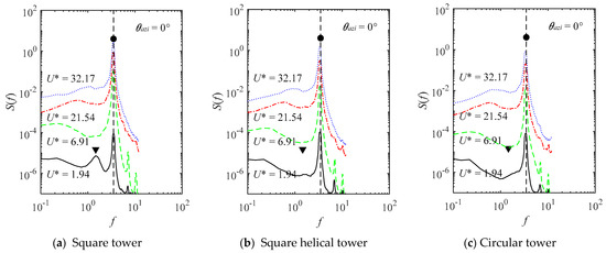 Figure 10 shows the power spectral densities of the wind turbine installed on the square, square helical, and circular towers for wind direction θwd = 0° and azimuth angle θazi = 0°. When the reduced velocity U* was small (U* = 1.94), there were two clear peaks for the square wind turbine, one for the vortex shedding frequency fs (▼ in the figure) and the other for the system’s natural frequency f0 (● in the figure), but the peaks for the vortex shedding frequency became small with increasing number of sides. In addition, for larger reduced velocities, only one peak was found over a wide range of reduced velocities. For the wind turbine cases, no peaks in the high-frequency range induced by vortex shedding were observed for all cases.