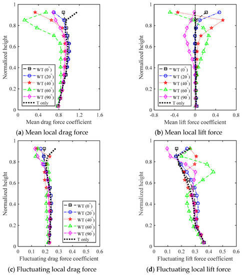Figure 11 shows the variation of local force coefficients of tetradecagonal wind turbine at θpit = 90° and θazi = 90° for various wind directions. Local force coefficients were defined by the reference wind speed at hub height (Uref = 5 m/s) and reference width of circular tower at 0.5 Href (Dref = 0.05 m). As the effect of pitch angle on forces on the tower was very small [18], the results for a pitch angle of 90° were used, and “T only” in the legend indicates the tower-only case without topside structure. At azimuth angle θazi = 90°, as one of the blades was located in front of the tower for the oblique wind directions, it was found that local force coefficients near the top varied greatly. Local drag force coefficients of the wind turbine were smaller than that for the tower-only case (T only), while the local lift force coefficients showed larger absolute values than that for the tower-only case. In particular, large absolute values were found for the oblique wind directions: wind direction 40° for mean lift force coefficient and wind direction 60° for fluctuating lift force coefficient. When the azimuth angles were θazi = 0° and θazi = 30°, the variations of the force coefficients were generally small, showing similar values to the tower-only case, and when the azimuth angle was θazi = 60°, the variations of the force coefficients were similar to those in Figure 11 [18].