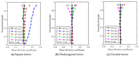 Figure 12 shows the variations of mean lift force coefficients depending on number of sides of towers at θpit = 90° and θazi = 0°. Although large mean lift forces were found for wind direction 20° for the square wind turbine, the variation of mean lift force coefficient was generally small, and this trend became more significant when the number of sides increased. Similar trends were found for azimuth angle θazi = 30° and for other force components.