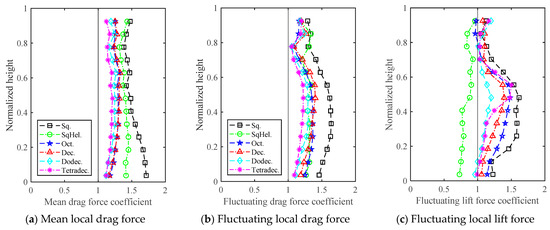 In the tower’s design, maximum force coefficients for all wind directions and all azimuth angles were generally used. The maximum force coefficients for all considered cases at each height were chosen, and the ratios to the circular wind turbine are shown in Figure 13. As for the mean and fluctuating local drag force coefficients, they decreased with increasing number of sides, showing the largest values for the square wind turbine and the smallest values for the tetradecagon wind turbine. For the fluctuating lift force coefficients, in essence, they also decreased with increasing number of sides, but the fluctuating lift force coefficients of the square helical wind turbine showed even smaller values than the circular wind turbine. For tall buildings and structures, the helical/twisting shape is well known to be efficient in mitigating fluctuating lift forces, and this was confirmed again, even for the wind turbine.