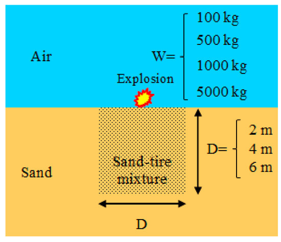 A numerical analysis is used in this research to evaluate the behavior of sand–tire shred mixtures under surface explosion hazards and investigate whether this mixture can be introduced as an effective method to protect underground structures from peak blast pressure. Figure 1 shows the explosion scenarios investigated in this research. A sand layer is initially subjected to four surface explosions with 100, 500, 1000, and 5000 kg charges. The sand–tire shred mixture is then introduced to the model with 2, 4, and 6 m thicknesses and subjected to the same surface explosions.