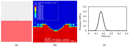 Results of numerical model simulation in ABAQUS software: (a) model before the explosion; and (b) blast-induced crater after the explosion; and (c) time history of blast pressure at a depth of 10 m.