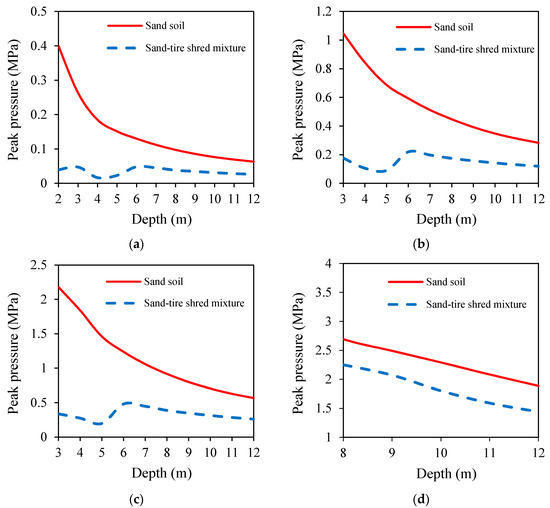 Figure 3 presents the simulation results in terms of peak blast pressure at different depths under charge weight explosion scenarios. The results indicate that the sand–tire shred mixture contributes to a significant reduction of peak blast pressure. It is worth noting that peak blast pressure data are only available at depths below the base of the craters (see Table 5). The most significant reduction is 90%, which was achieved at a depth of 2 m under a 100 kg charge, followed by an 84% reduction at a depth of 3 m under a 1000 kg charge, an 83% reduction at a depth of 3 m under a 500 kg charge, and a reduction of 23.6% at a depth of 11 m under a 5000 kg charge. The peak blast pressure reduction at the base of the mixture layers—6 m below the surface—under the surface explosion charges of 100, 500, and 1000 kg was 63%, 63%, and 61%, respectively. Due to the extension of the crater to a depth of 7.8 m below a 5000 kg charge, the first peak blast pressure data for this mixture layer were available at a depth of 8 m below the surface, showing a reduction of 23% compared with pure sand.