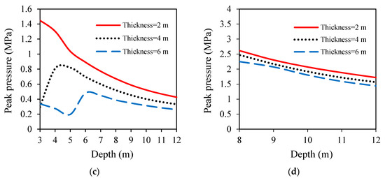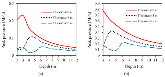 Two additional sand–tire shred mixture layers with thicknesses of 2 and 4 m and the same mixture of 30% shred tire (rubber) and 70% sand are added to the investigation to evaluate the effect of layer thickness on peak blast pressure under different explosion scenarios. Figure 4 shows the results of the simulations for the three mixture layers with varying thicknesses under four surface explosion charges. The results show that the thickness of the sand–tire shred mixture has a significant effect on its behavior under an explosion hazard, especially at lower depths. The overall behavior of the mixture layers indicates the positive impact of thicker layers in reducing peak pressure. This impact is more noticeable up to the interface of the mixture layers with sand. An increase in the value of peak blast pressure is seen at the interface of the layers, followed by a gradual decrease at a greater depth.