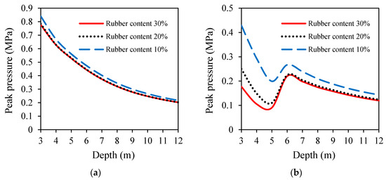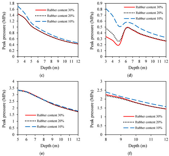 The effect of different rubber contents on the peak blast pressure is evaluated in this section, following the mixture patterns stated in Table 2 [65]. Two new mixture layers, formed by 10% and 20% rubber contents added to 90% and 80% sand, respectively, are included in the analysis. Based on similar behavioral trends found in previous sections, the effect of rubber content is investigated only for the mixture layers with 2 and 6 m thicknesses under 500, 1000, and 5000 kg charges. Figure 5a,c,e shows that the rubber content does not significantly affect the peak blast pressure for the 2-m-thick mixture layer. However, it has a more evident impact on the 6-m-thick mixture layer, especially at lower depths, as seen in Figure 5b,d,f. For a 6-m-thick mixture layer subjected to a 500 kg charge (Figure 5b), the peak blast pressure decreases by 42% and 59% by increasing the rubber content from 10% to 20% and 30%, respectively. In a similar trend, the peak pressure for the same mixture layer under a 1000 kg charge (Figure 5d) shows a reduction of 41% and 58% by increasing the rubber content from 10% to 20% and 30%, respectively. The formation of a deep crater under a 5000 kg charge (Figure 5f) resulted in the least noticeable effect on peak pressure by increasing the rubber content. From the comparison between all the scenarios, it can be concluded that increasing the rubber content has a more significant effect on peak pressure reduction in lower depths and under lower power explosions.