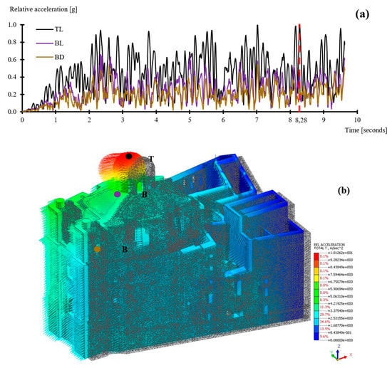 First, the three control points are defined based on the expected maximum drifts: TL (top of the lantern), BL (base of the lantern) and BD (base of the dome). The moduli of the relative acceleration are monitored over the time history analysis as reported in Figure 22a. The maximum acceleration results at 8.28 s in node TL positioned at 35.6 m height. At this time step, the displacements of the three control points are linearly proportional to the height of the structure, thus no relevant damage appears yet, as shown in Figure 22b. However, the acceleration of node TL results 3.4 times higher than BD and the acceleration of BL results 1.5 times higher than BD. This means that the lantern is subject to higher accelerations than the rest of the structure because of the dynamic amplification, this effect yields to the formation of local collapse mechanism with the persisting of the earthquake.
