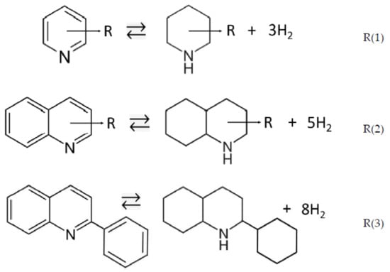 The liquid organic hydrogen carriers (LOHC) systems are considered as an attractive option for the storage and transport of hydrogen and enable the gradual transition from fossil fuels to a CO2 emission-free energy supply for both mobile and stationary applications. Hydrogen can be charged in LOHC and reversibly discharged with considerable amounts of hydrogen up to 6–7% wt. [1]. The LOHC-based energy storage is a challenging technology that requires research and development efforts to optimize its performance to a commercially attractive level. There is no shortage of ideas for suitable candidates for the LOHC systems. For example, the reversible hydrogenation/dehydrogenation reactions of substituted pyridines or quinolines according to Figure 1 could be interesting, since the main sources of pyridines and quinolines include petroleum, coal processing, wood preservation and shale oil, or they can be synthesized from anilines [2]. Provided that pyridines and quinolines have favorable thermodynamic properties, they could be considered as a potential LOHC system. Indeed, the gravimetric hydrogen storage capacities are 7.5% wt. for reaction 1, 6.3% wt. for reaction 2, and 5.4% wt. for reaction 3. Moreover, most of these compounds are low viscose liquids at ambient temperatures (e.g., the melting point and the dynamic viscosity of pyridine (236 K and 0.6 cP), quinoline (256 K and 3.0 cP), 2-methyl-pyridine (206 K and 0.8 cP), 4-methyl-pyridine (277 K and 0.9 cP), 2-methyl-qionoline (270 K and 4.3 cP), and 4-methyl-quinoline (283 K and 6.2 cP)). These thermophysical properties make the pyridines and quinolines attractive as potential LOHC. The 2-phenylquinoline with a melting temperature of 355.9 K is a technologically less attractive compound, but it can capture and release 8 moles of hydrogen.