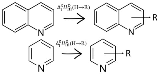 The “centerpiece” approach, which was already presented in Section 3.3.3, is not a remedy, but a practicable method for estimating the liquid-phase enthalpies of formation of the perhydrogenated species. Indeed, the “centerpieces”, such as piperidine of decahydroquinoline, have reliable experimental (liq, 298.15 K)-values (see Table S6). Different substituents can be attached to these “centerpieces” in different positions. The visualization of the “centerpiece” approach for the “hydrogen reach” pyridine derivatives is given in Figure 3 and for the “hydrogen reach” quinoline derivatives is given in Figure 4 and Figure 5.