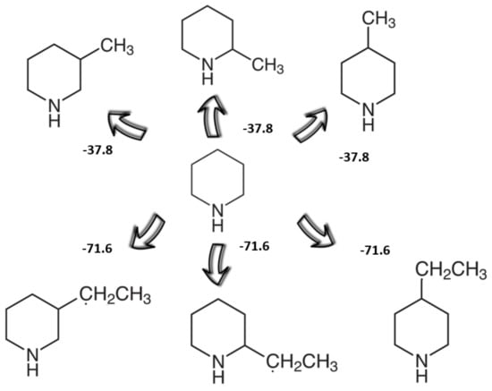 Evaluation of increments H→CH3 for (liq) responsible for exchange of H-atom in piperidine ring with the methyl group. The averaged increment (−37.8 ± 0.8) kJ·mol−1 for the H→CH3 substitution was derived as it shown in Figure S4. The increment H→CH2CH3 was calculated based on the enthalpies of formation of piperidine, 4-ethyl-piperidine (numerical data are given in Table S6).