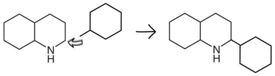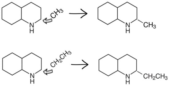 Calculation of enthalpies of formation, (liq), of alkyl-substituted decahydroquinolines using the H→CH3 (−37.8 ± 0.8) and H→CH2CH3 (−71.6 ± 1.8) increments for piperidine ring (see Figure 3).