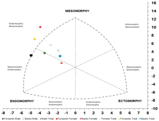 Regarding somatotype (see Figure 1), no statistically significant differences by sex were detected for any component (endomorph, p = 0.543; mesomorph, p = 0.146; ectomorph, p = 0.737). However, a comparison by position revealed a higher endomorph component in forwards compared to backs (p = 0.018), which only reached statistical significance in male rugby players (p = 0.013). The higher endomorph component paralleled a trend towards having a lower ectomorph component in forwards with respect to backs (p = 0.052), with no differences in the mesomorph component (p = 0.141). In general, muscle-adipose development predominated in both sexes.