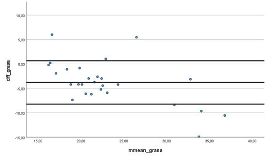 The concordance between both methods (anthropometry and BIA) for the percentage of fat mass and muscle mass was evaluated using the Bland–Altman diagram. Heteroscedasticity was examined using the White test and the Breusch–Pagan test, checking the effect size. Finally, the Pearson correlation coefficient was obtained between all the variables.