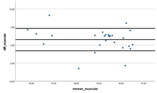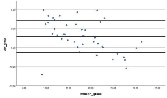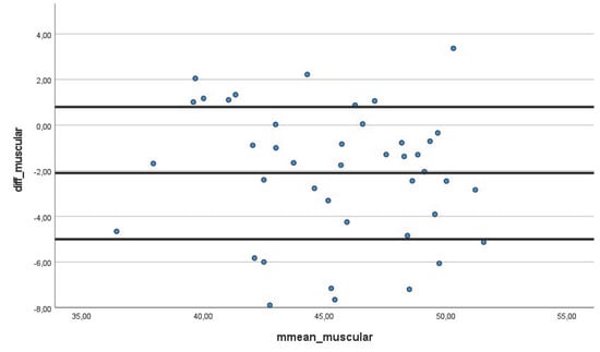 There is a concordance between the anthropometry and BIA in the fat mass percentage (ICC, Intraclass Correlation Coefficient, of 0.743 in women and 0.786 in men) and in the muscle mass percentage (0.663 in women and 0.748 in men). In the Bland–Altman graphs, an undervaluation of the BIA is observed when the value of the fat mass percentage is less than 15%, and an overvaluation when it is greater than 25%. This pattern is not seen in muscle mass percentage (Figure 2, Figure 3, Figure 4 and Figure 5).