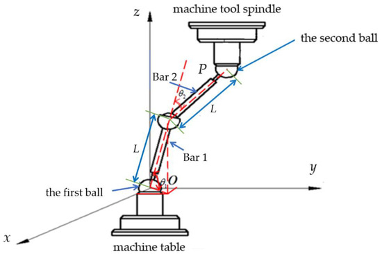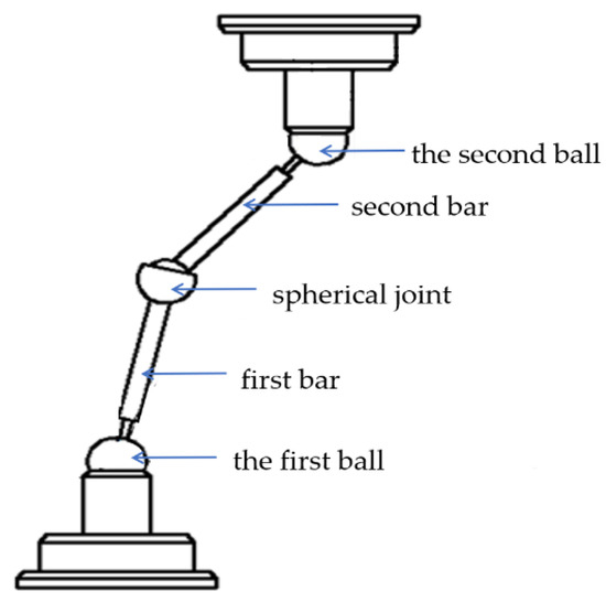 Generally, the length of the bar in traditional DBB is constant. Several bars with different lengths are required for different errors measurement radius of the machine tool. The limited work scope and discontinuous error measurement radius have afflicted scholars and mechanical engineers for several decades. A new device named J-DBB with a freely measuring radius was proposed to measure the errors of the CNC machine tool [23]. As shown in Figure 1, this new device consists of a spherical joint, two connecting bars, and two precision balls. Compared with DBB, the J-DBB realizes the full range error measurement of the machine tool by adding a spherical joint, which helps to better understand the spatial distribution of machine tool errors and provides guidance for the reasonable selection of working areas to improve the machining accuracy of parts. Unfortunately, there is currently no sensor that can accurately measure the spatial angle of the spherical joint. Therefore, J-DBB adopts the mechanical decoupling frames (MDF) structure to measure the angle of the spherical joint.