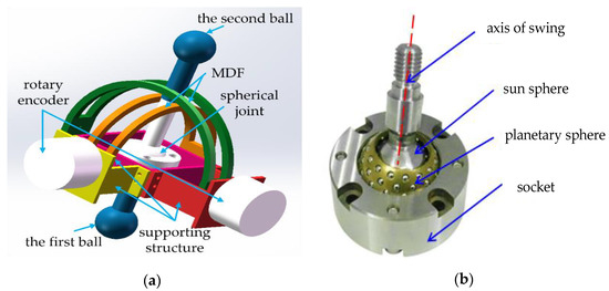 When the second ball moves with the CNC machine tool spindle, the motion is divided into the rotary movement of the two MDF. Because the two MDF are vertical, the motion of the spherical joint is turned into two vertical rotations. The angle of rotation can be measured by a rotary encoder. The friction of the spherical joint can affect the measurement accuracy. To measure the error with high accuracy, the spherical joint needs a high rotation accuracy and low frictional force. In this paper, the spherical joint consists of a sun sphere and several planetary spheres, as shown in Figure 2b. Because of the unitized structure, low frictional force and zero clearance is achieved by the spherical joint with high rotation accuracy.
