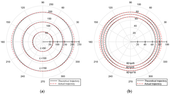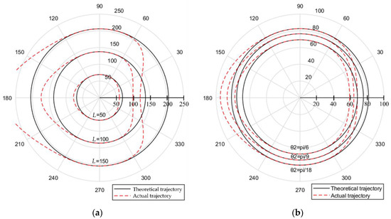 According to Equations (18), (19) and (21), the second-order contraction error of the ball screw and liner grating can be determined. In the comparison diagram shown in Figure 5, the solid black lines represent the design trajectory of the circular motion of the machine tool spindle, and the dotted red lines represent the real trajectory of the circular motion of the machine tool spindle. We can see that the real trajectory is less than the design one near 0°and the real trajectory is more than the design one near 180° for different L and θ2. Figure 5a shows that the equipment error increases with the increase of length L, and Figure 5b shows that the equipment error is unchangeable with the variation of angle.