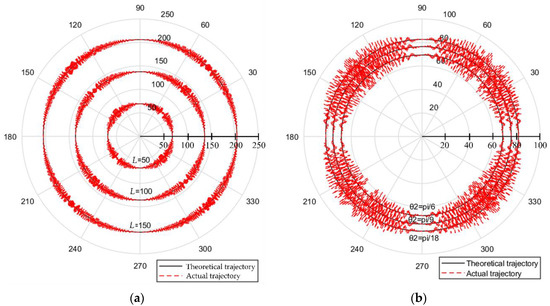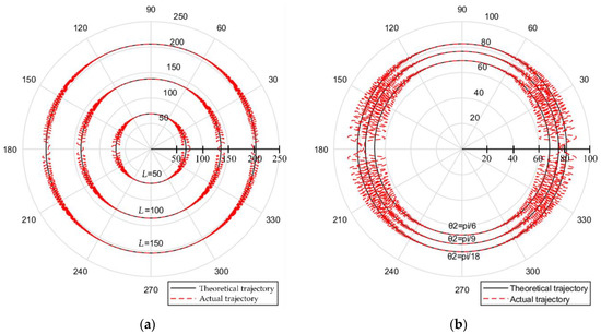 According to Equations (18)–(20), the first-order contraction error of the ball screw and linear grating can be obtained. The measurement radii of J-DBB vary with both the length of the bars and angles of the two bars. In the comparison diagram shown in Figure 4, the solid black lines represent the designed trajectory of the circular motion of the machine tool, and the dotted red lines represent the real trajectory of the circular motion of the machine tool. Figure 4a depicts the variations of the trajectories with different lengths of the bars. Figure 4b depicts the variations of the trajectories with the angles of the two bars. The results suggest that when the angle of the machine tool spindle is 0°and 180°, the errors are larger. On the side, the angle of the machine tool spindle is 90°and 270°, and the errors are smaller. Figure 4 shows that the equipment error increases with the increase of length L and is unchangeable with the variation of angle.