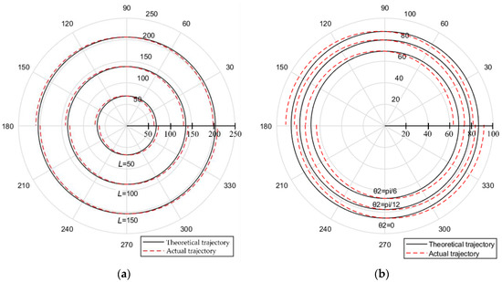 According to Equations (18), (19) and (22), the periodic error of the ball screw and linear grating can be procured. In the comparison diagram shown in Figure 6, the solid black lines represent the design trajectory of the circular motion of the machine tool spindle, and the dotted red lines represent the real trajectory of the circular motion of the machine tool spindle. Figure 6a illustrates the variation of the real trajectory of the machine tool with the different lengths of the bars. Figure 6b illustrates the variation of the real trajectory of the machine tool with the angle of the bars. We know that the real trajectory is consistent with the design one near 90°and 270°. In addition, the real trajectory has a larger amplitude near 0°and 180°for different L and θ2.