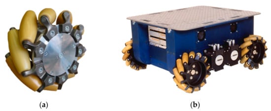 - Gwpcmu. Mecanum Wheel. Attribution 3.0 Unported (CC BY 3.0). Available online: https://en.wikipedia.org/wiki/Mecanum_wheel#/media/File:UranusOmniDirectionalRobotPodnar.png (accessed on 27 October 2020).