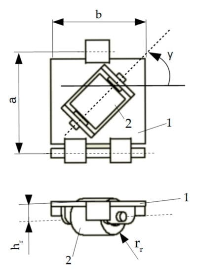Tracks in the continuous track system are composed of a closed sequence of several dozen links that are connected to one another with rotating pairs. In the case of multidirectional tracks, each link is equipped with an additional rotating roller positioned at angle γ (usually 30° < γ < 60°) to the link axis. The view of a single link with length a, width b, and height h, and also a cylindrical roller with radius rr,, is presented in Figure 4.