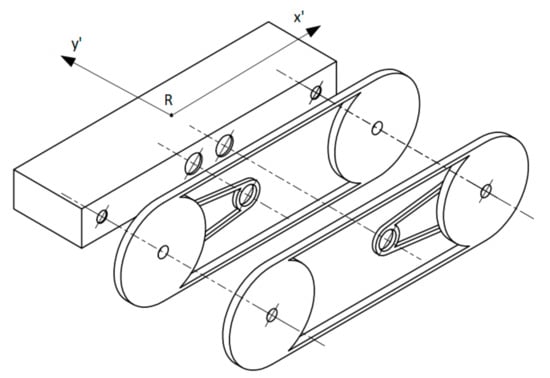 The designed mobile robot is equipped with four independent continuous track systems with multidirectional tracks that have only drive wheels and idlers. It is a four-degrees-of-freedom system. The drive is transferred from the rotating drives to the drive wheels using belts. In the middle part of the robot’s body, at point R, the local x’y’ coordinate system is located. The kinematic scheme of the robot is shown in Figure 5.