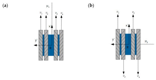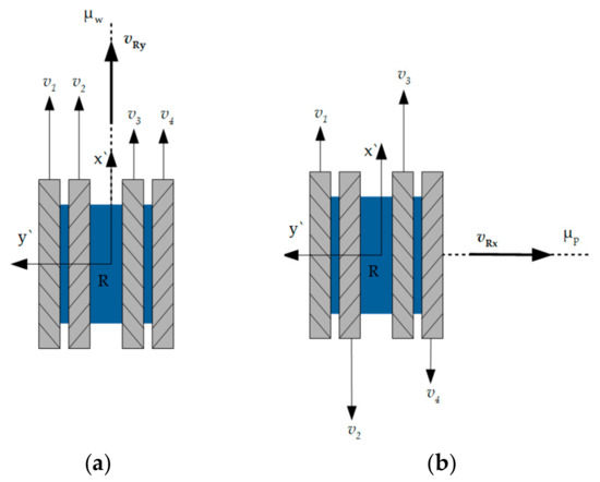 The excitation of the robot’s motion along the set trajectory requires a suitable control of speeds v1, v2, v3, v4 of tracks 1, 2, 3, 4. This paper discusses robot motion along two trajectories: a straight line μw at constant speed vRx along the longitudinal axis, and a straight line μp at constant speed vRy along the robot’s transverse axis (Figure 11). In the case of motion along the longitudinal axis at speed vRx, the tracks should move at the same speeds (Figure 11):