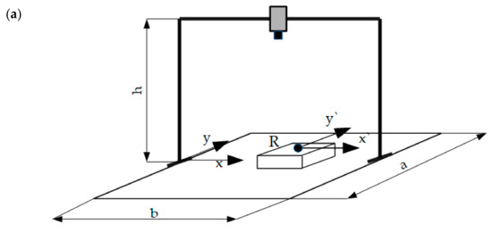 The vision-based system records and analyses images with a frequency of 25 Hz (frames/s). In order to allow for the detection of the robot’s position in a camera image, the vision marker ArUco was placed on its top surface (Figure 14). The ArUco marker is a print on a flat tile with white and black rectangles. Owing to the precisely defined distribution of these areas, the marker can transfer its ID number, and it is therefore possible to recognize its presence in a ready image, as well as to determine its linear and angular position. For known dimensions, it is also possible to conduct a programmable estimation of its location in three-dimensional space. The middle of the marker is located in point R on the robot’s body (Figure 14). During the measurement, the whole marker must be located in the camera vision area—this efficiently reduces the observation area to the area of the following dimensions: a = 0.75 m, b = 1.30 m.