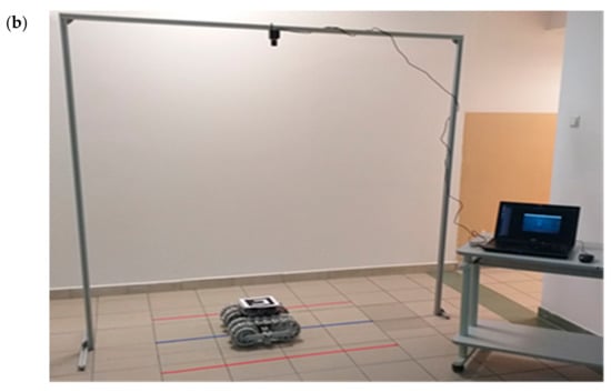 The robot is controlled by RoboTrack software (Figure 15), which allows robot motion to be controlled and track and motor motion to be registered. The software was integrated with a VisionM module that allows the covered distance to be measured and recorded. This module is based on OpenCV libraries that are extended with OpenCV Contrib [37] modules. Its task is the online analysis of individual image frames recorded by a camera placed on the test stand. The module provides data on the angular orientation of the tracked robot, its current location and the distance covered, which are recorded in real time.