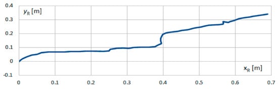 During the transverse motion, the robot did not cover the whole planned distance (L2 = 1.2 m), and the measurement was interrupted after it had covered the distance of 0.7 m (Figure 25) because the robot overstepped the measurement area boundary in the direction of the y axis. In the case of the transverse motion, the final orientation change was Δα = 35° (Figure 24), and the location error of point R was ΔyR= 0.36 m (Figure 25) at time t = 10.8 s.