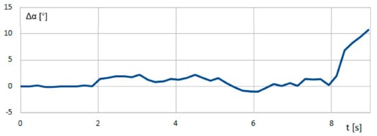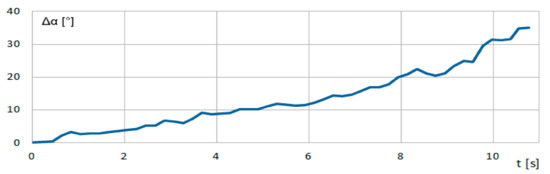 The change of body orientation Δα after t = 9 s, i.e., at the time equal to the longitudinal drive without speed correction was 11° (Figure 32), while the location error was ΔyR = 0.07 m (Figure 33).