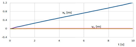 In the case of the longitudinal motion, the final location error of point R was ΔyR= 0.037 m (Figure 21), while the orientation change was Δα =5° (Figure 20) at time t = 10 s.