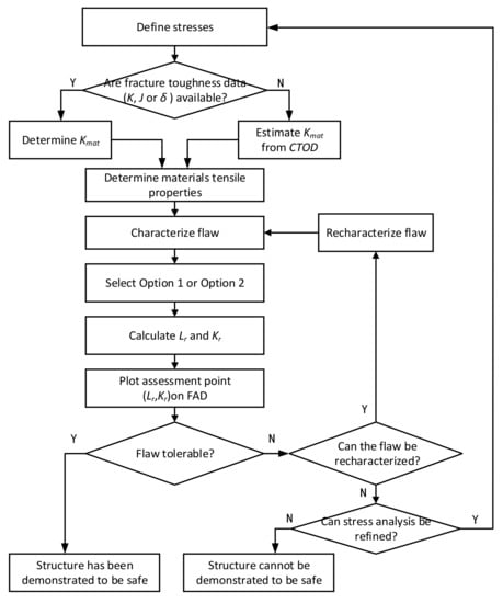 The BS 7910 evaluation method is proposed on the basis of engineering critical assessment (ECA), which provides guidelines and suggestions for assessing the acceptability of flaws in metallic structures. The methods described in this standard can be applied to all stages of design, manufacturing, and operation over the lifecycle of a structure. The BS 7910-2019 standard describes three different options, which are summarized as follows: