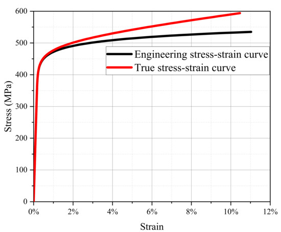The engineering stress-strain curve of the pipe was converted into the true stress-strain curve using Equation (3).
