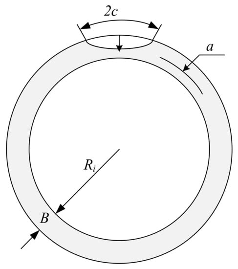 In practice, multiple adjacent cracks interact with each other, and the effect of this interaction is much stronger than that of a single crack. If multiple cracks exist, the interaction of each crack with the adjacent cracks should be assessed based on the original size of each crack, and, if necessary, combined into a single crack. Based on the combined crack method in BS 7910, a circumferential surface defect was assumed to exist on the outer surface of the pipe girth weld (Figure 4).